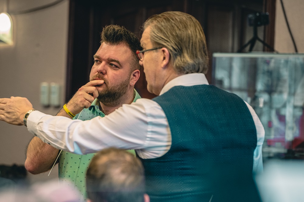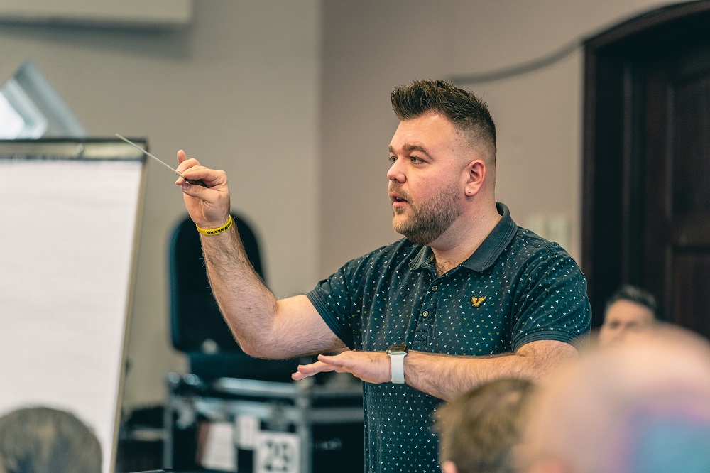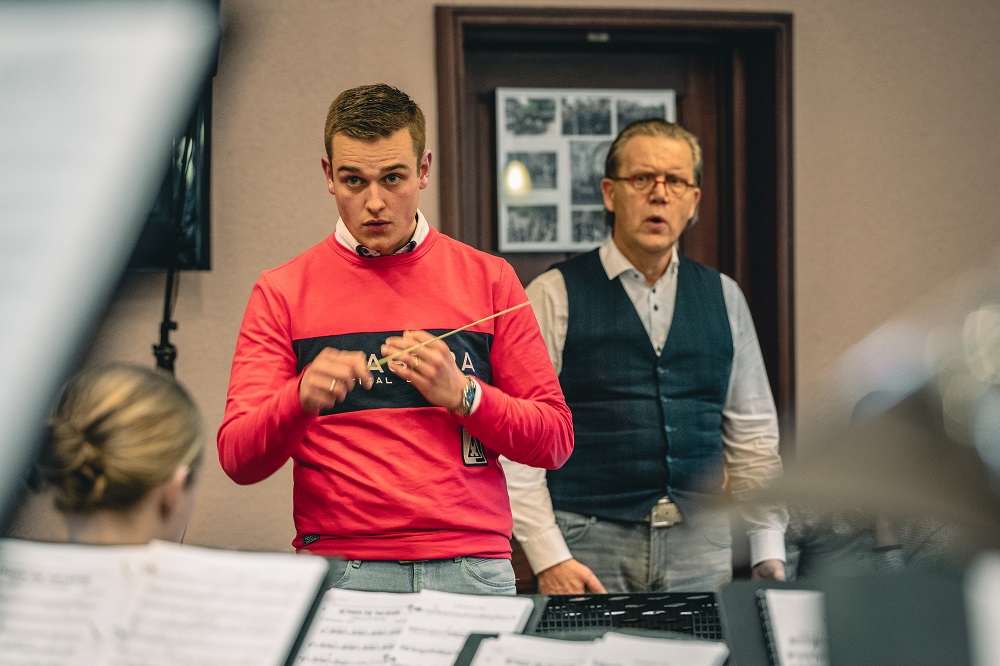 Alex Schillings weet tijdens de masterclass met zijn bloemrijke taal, zonder een blad voor de mond te nemen en vooral met veel humor en passie voor het directievak, precies de juiste toon aan te slaan. Op het programma stonden een aantal grootheden uit het fanfarerepertoire. Zo speelt het orkest voor deze gelegenheid onder meer ‘Variations Symphoniques’ van de Belgische componist Paul Gilson. ‘Gilson is de grootste componist die België en Nederland ooit gekend hebben op het gebied van fanfaremuziek,’ vertelt Schillings, die na de lunch haast een klein college over deze bijzondere componist geeft. Hij roemt de harmonische constructies die Gilson maakte en benadrukt meer dan eens dat Gilson, net als coryfee Henk van Lijnschoten wiens partituur Jeu de Cuivre op het programma staat, veel te weinig gespeeld wordt. Aan studente Antonia de taak om de eerste paar variaties uit het werk van Gilson in goede banen te leiden.